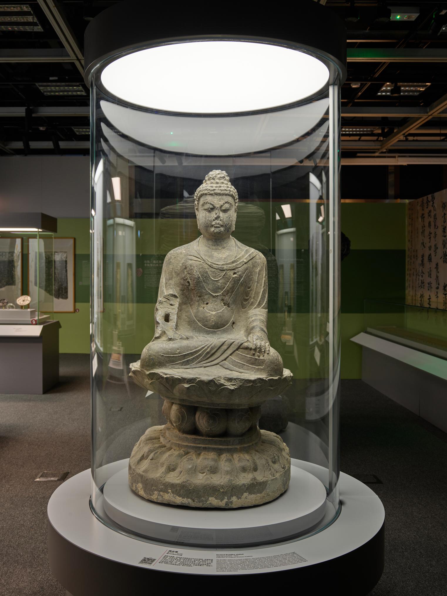 圓雕佛坐像在1980年於敬善寺洞附近發現,是龍門石窟中一個研究唐代佛教藝術與皇室信仰的重要石窟。(龍門石窟研究院藏)
