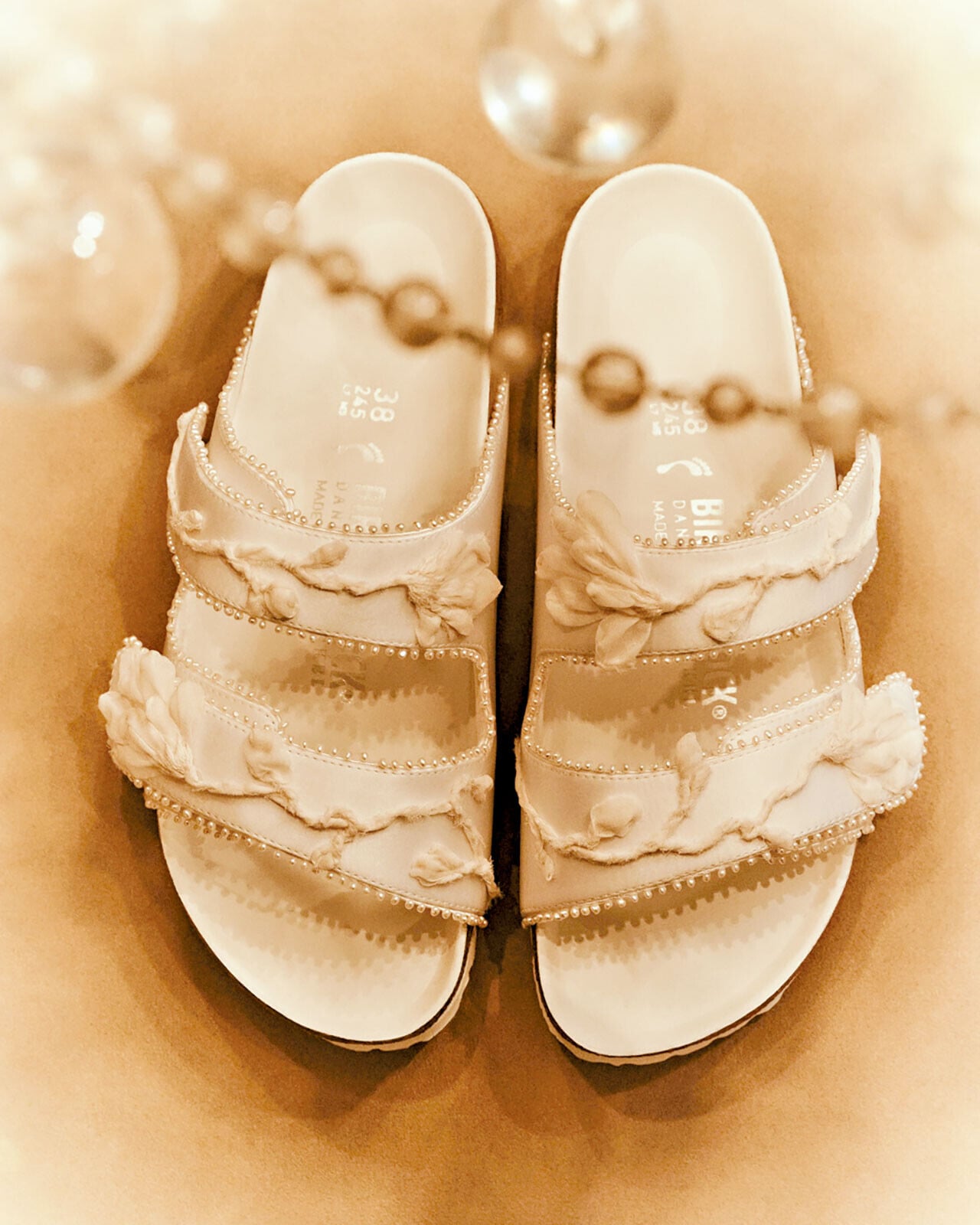 Danielle Frankel從超過700款Birkenstock鞋型中精挑細選出三款經典,再加入珍珠、手工編織鞋帶同花卉圖案外底等細節,將品牌一貫嘅浪漫情調完美注入。重點係——全部都保留Birkenstock標誌性軟木乳膠鞋床,靚之餘仲舒服到可以由宣誓企到after party 。