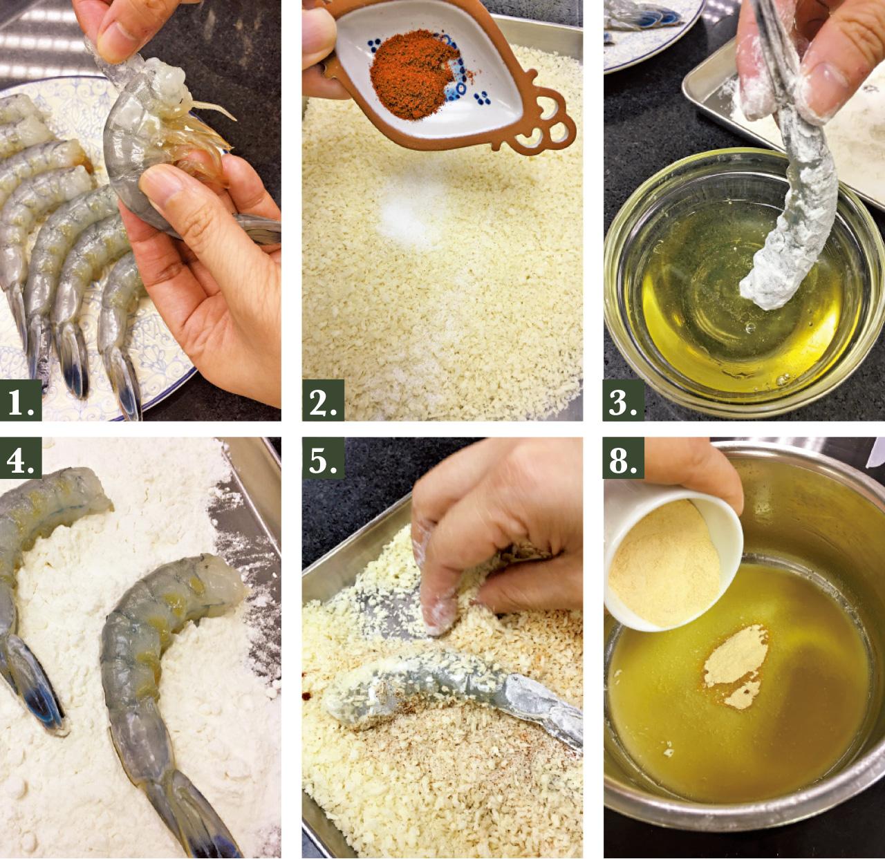 3-5.蝦撲上麵粉,蘸蛋白,再沾上麵包糠。