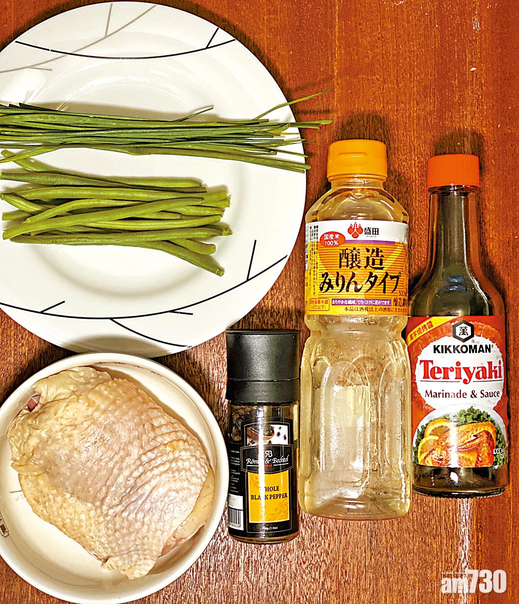 材料:阿波尾雞髀肉一至兩塊、法邊豆、細蔥、燒汁豉油、味醂、鹽、糖、黑椒。