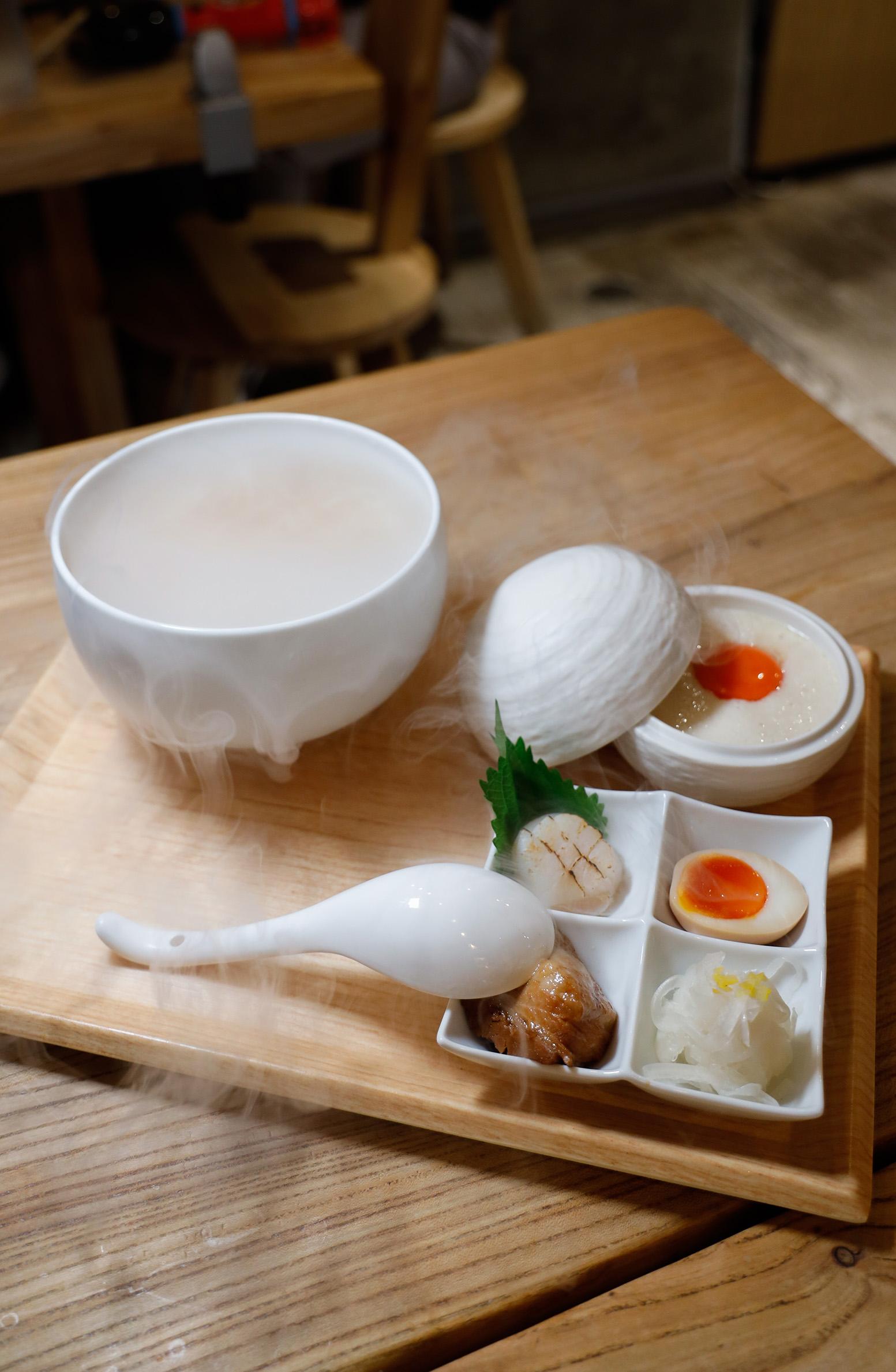 立体派秋冬限定的涼風紅楚蟹高湯鹽冷麵($238),端上桌時,店員會on top噴上一個泡泡,客人輕輕一吹,泡泡隨即爆破,泡內的柑橘香氣四溢,與鹽冷麵的鹹香來個對比,非常有趣,而湯底用來自日本鳥取縣的紅楚蟹熬製,鹽醬汁則以「笹川流藻鹽」加「瀨戶內粗鹽」調配,再加上白醬油及花蛤,鹹香鮮香同時爆發;幼麵條用上北海道夢之力小麥粉,口感爽彈;配料有炙燒北海道帆立貝、赤心蛋(蘭王蛋)、北海道十勝豚肉、自家製的醋漬洋蔥,其實二百多元一碗集齊「好吃」「吸睛」「IGable」,價錢合理。