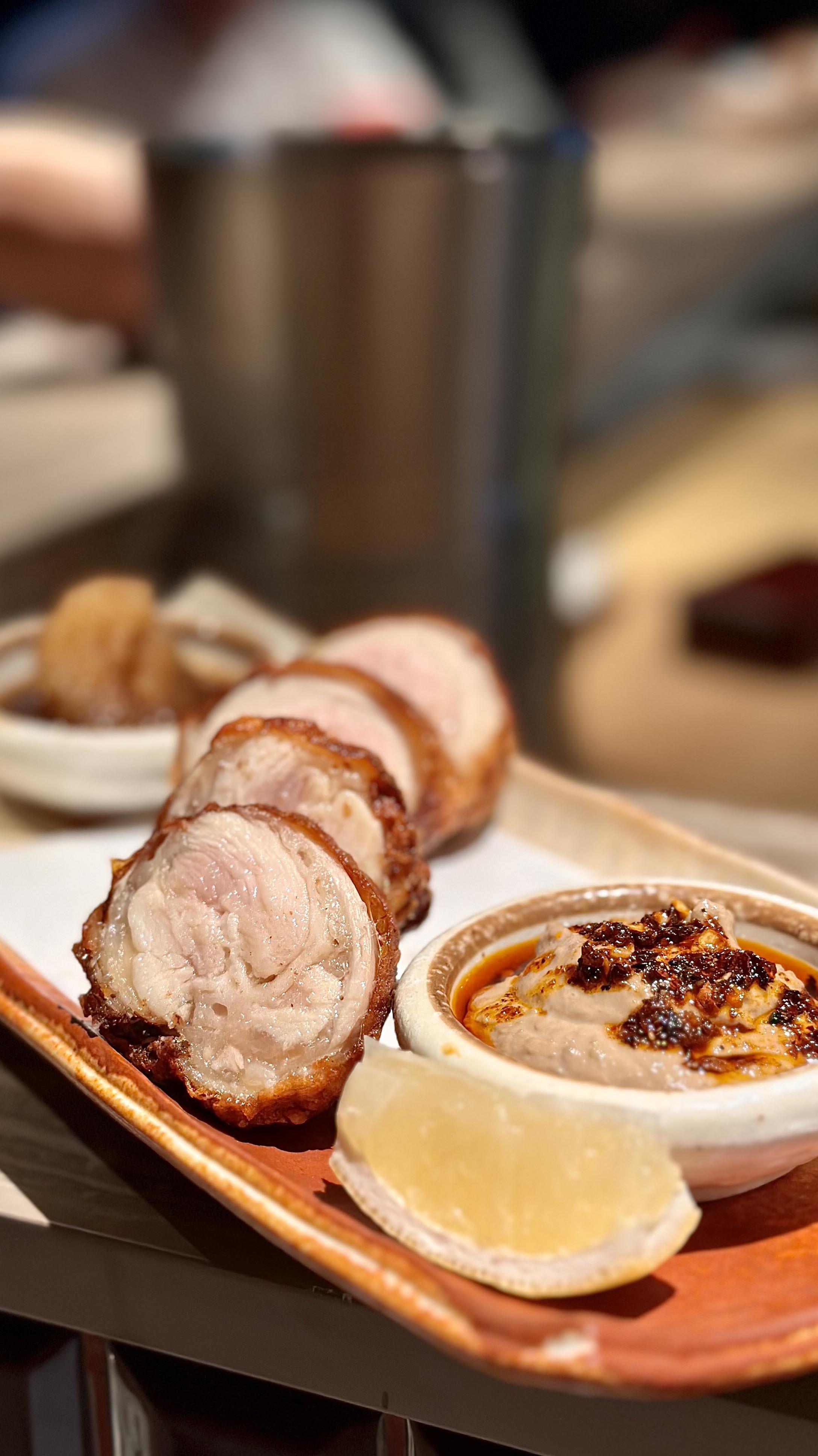 招牌雞唐揚配麻辣雞肝醬──用上阿波美雞,炸得非常脆!雞肉非常多汁!非常爽彈!非常嫩滑!另一件炸蝦配他他醬又是一絕,UZA的炸物足以K.O香港好多日式炸嘢食肆。