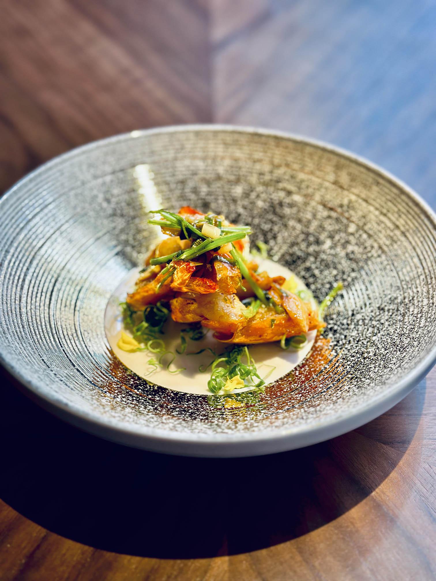 這裏的菜,是貼近香港現代粵菜的思維,講究還原傳統和創意改造之間的微妙平衡,擺盤精簡中凸出主題食材的可觀及可塑性,充分借鑑了西菜在這方面的優點。由冷菜起始,「慢煮豆醬馬友」是類近「好酒好蔡」的做法;潮式魚飯由全魚改為切件,吃得精美和精準。「香蔥蒜脫脂水晶雞」是鎮江肴肉的鮮雞版,去脂雞皮作外衣,碎雞肉夾心,雞不適合鎮江醋和薑絲,配上青蔥蓉及炸蒜碎,味道既熟悉又新鮮。