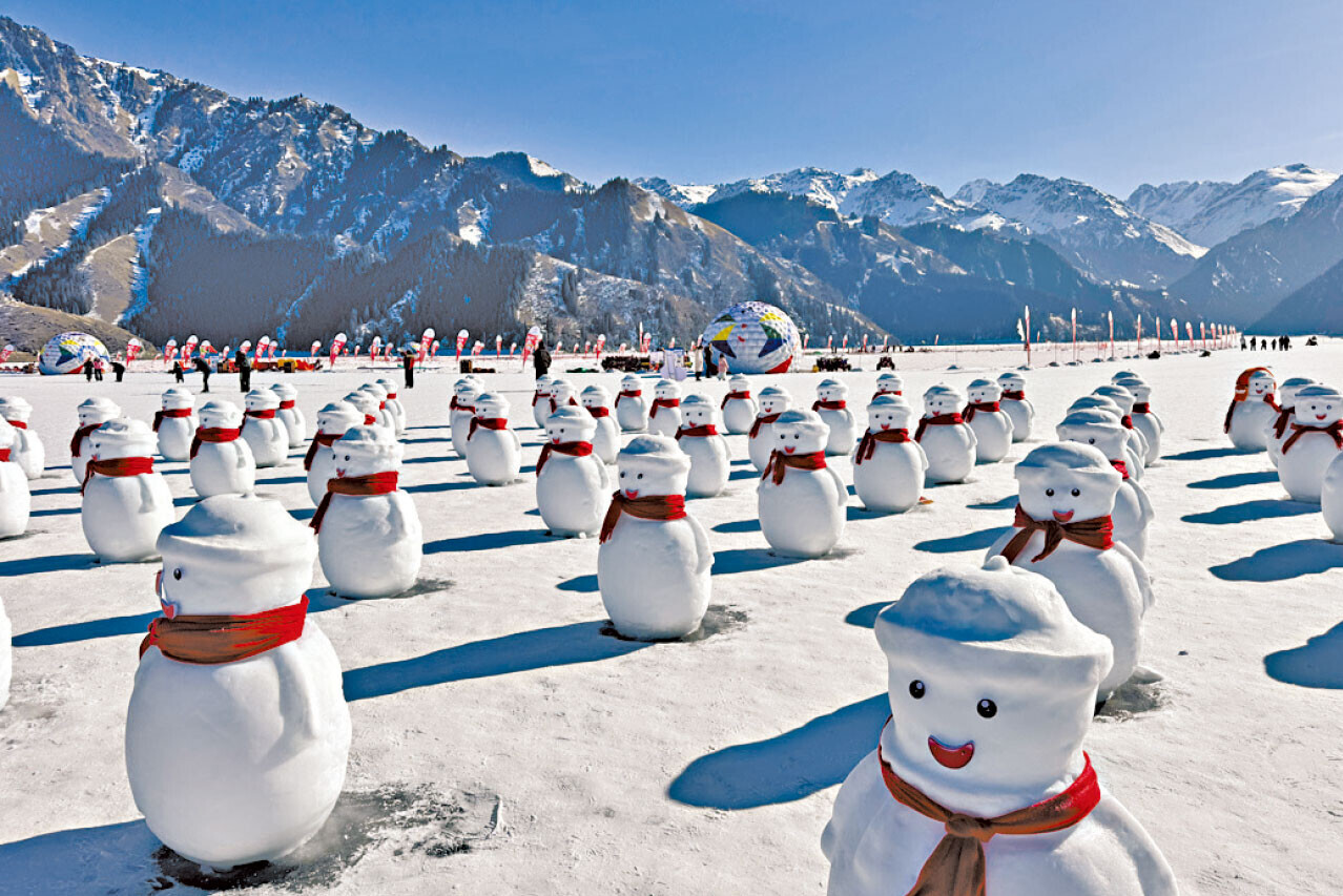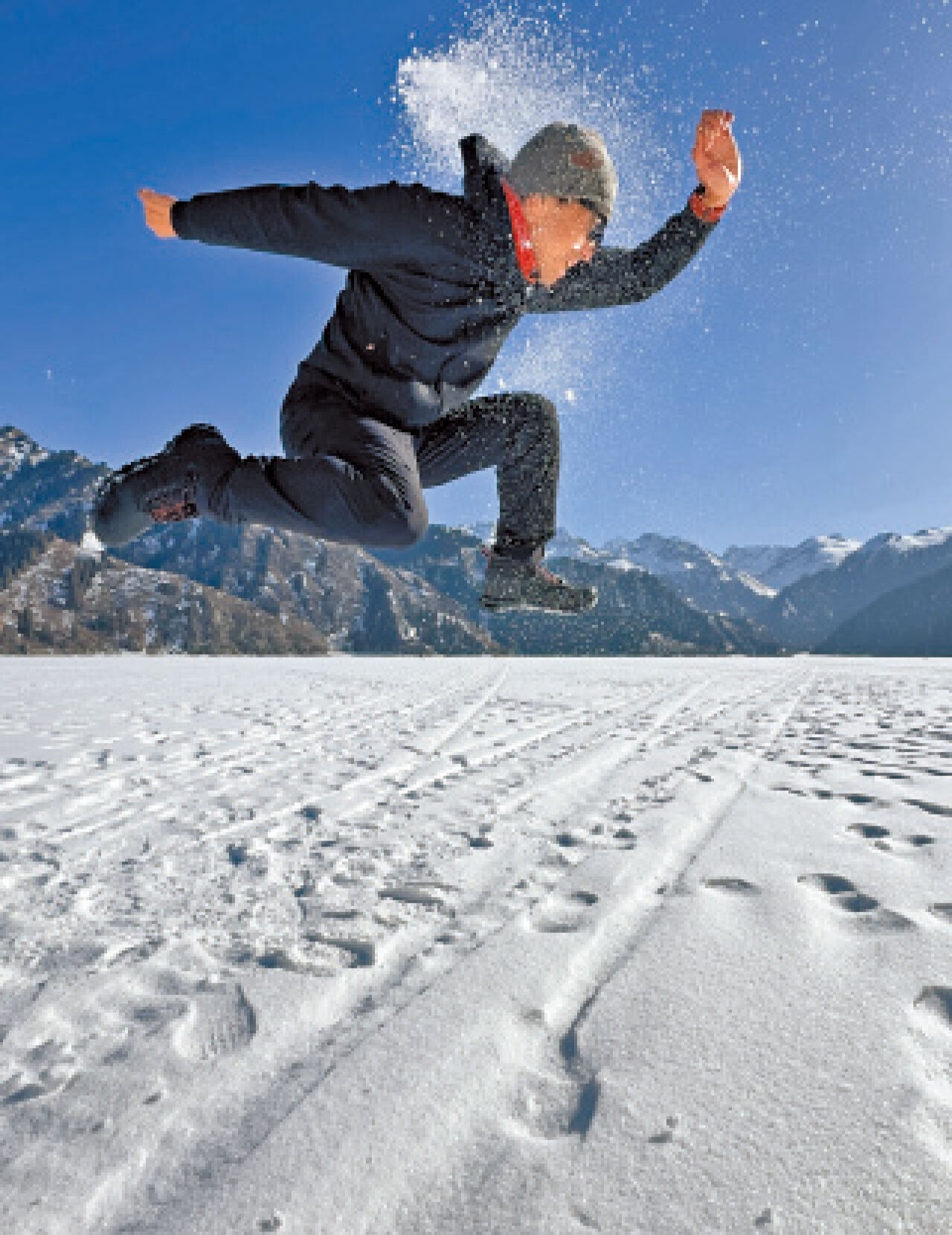 天池上已開放給遊人玩樂,冰上滑梯、電動卡車、香蕉船、冰上足球等等,應有盡有。很多家庭老少在遊玩,也有在拍婚紗照,青年男女在打卡、直播,是個遊樂場般的氛圍。真想在天池上跑跑,但身穿厚重衣物,打底長褲,加上雪鞋身笨重,跑不?來都來了,拜託好友「照顧」大衣,懇求珍貴的一小時任性時光。天池被天山群峰環抱,呈長形,我向著最遠處奔跑。起步不久便氣喘如牛,忘記是1,910米高海拔。越跑越遠,遊人的腳印也越見減少。踏上新雪,身下一沉,不好用力,卻留下一列全新足跡。呼吸著寒冷空氣,跑在白雪,上次已是在跑南極連日超馬的體感。跑到碼頭旁,有趣的不是在碼頭上看湖,而是站在湖上回望。跑到給圍欄截著,不能再前行。站著,寧靜,難得站在天池上,感受著天山靈氣。忽發奇想,不如轉湖一圈,當然其實只是天池的北面。由北端遊客落腳點,順時針沿天池邊跑,享受環山的風景,跑過在湖邊山上的西王母祖廟……一圈回到起點。