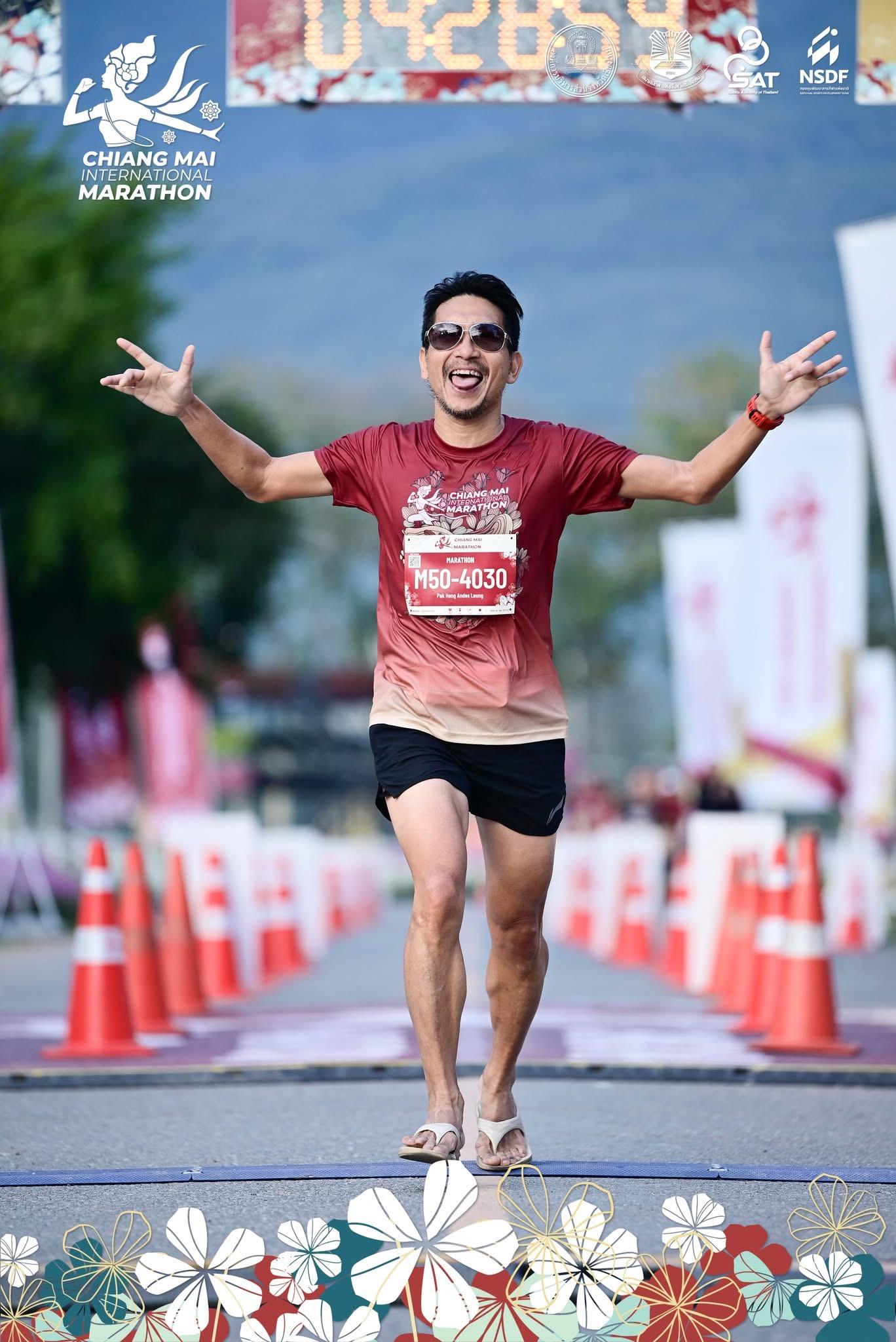 在漆黑的Pao Park公園中,閃亮的花邊拱門,強勁節奏的音樂下起步。跑在寂靜的街道上是一種享受,隨著指示跑到清邁市中心。跑入舊城區,穿梭大街小巷。特色是跑過宏偉廟宇,在黑暗中泛著金光。我之前練習不多,又剛跑完100公里山賽,對完賽時間沒懸念,只想均速發揮。隨著體感慢跑,首三十公里都是時速十公里,不累。可是最後十公里,不像撞牆斷崖式疲累,但速度卻漸漸減慢。天空開始光亮,不睏但累,自醒要放鬆腳板,專心提腿不拖腳,全掌落地緩震。沒有抽筋卻也快不來,開心喜悅地跑過終點,無傷跑畢全馬,感謝Phyllis接「放學」。
