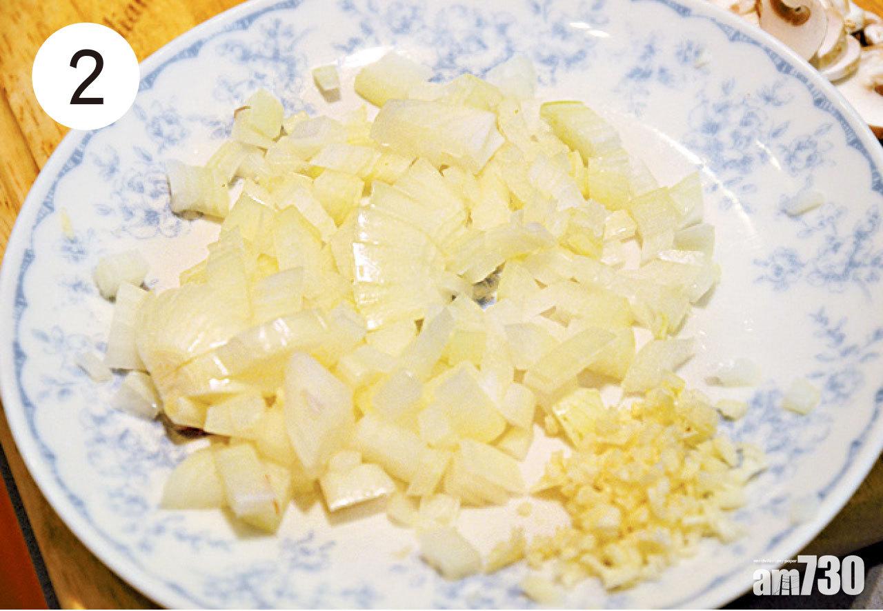 3-4. 燒熱易潔鑊,下油爆香蒜蓉和洋葱碎,再放入雞粒和蘑菇片,炒至半熟。