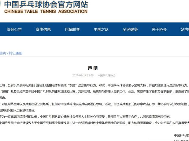 • 中國乒乓球協會:強烈譴責體育領域飯圈違法犯罪行為