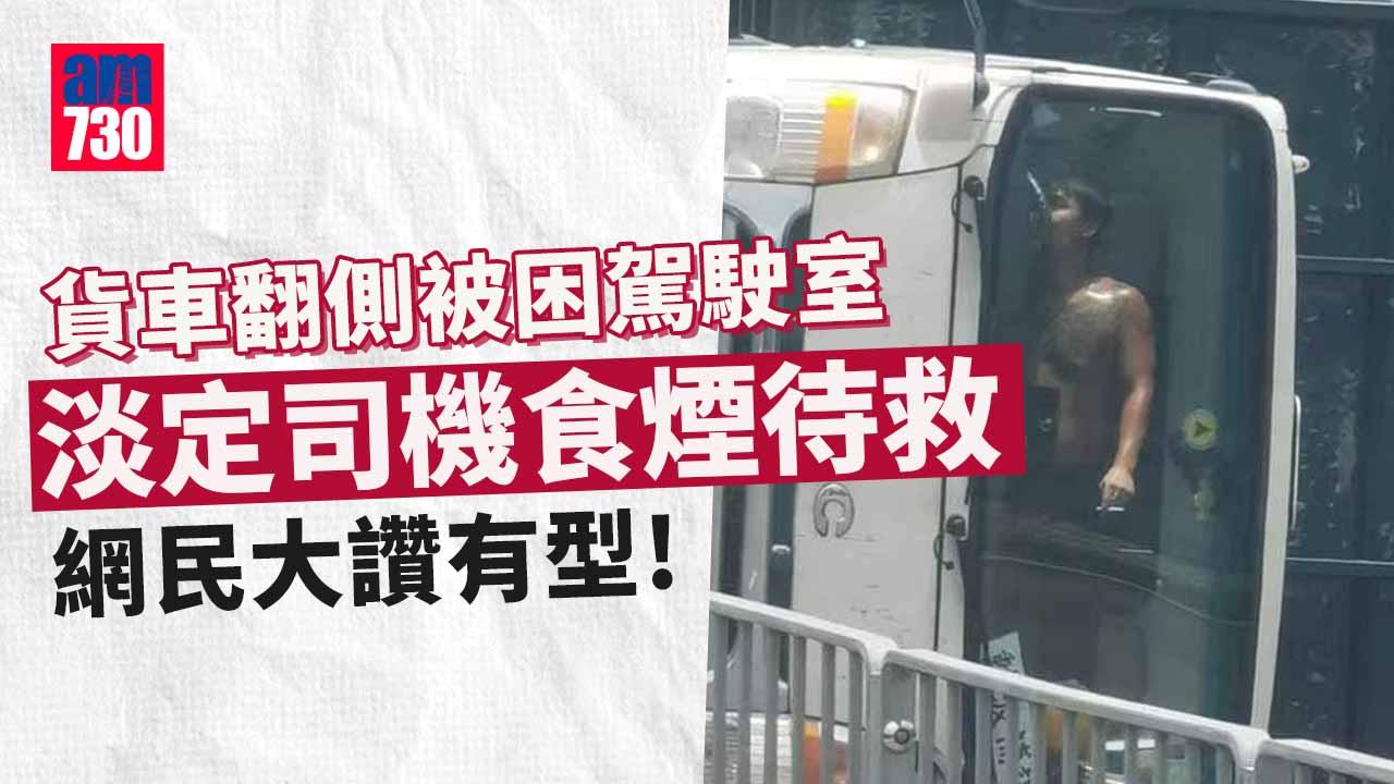 網上熱話|貨車翻側被困駕駛室 淡定司機食煙待救