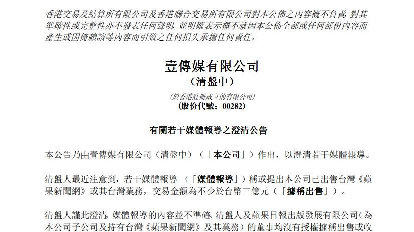 壹傳媒清盤人澄清沒有授權報稱出售台灣業務