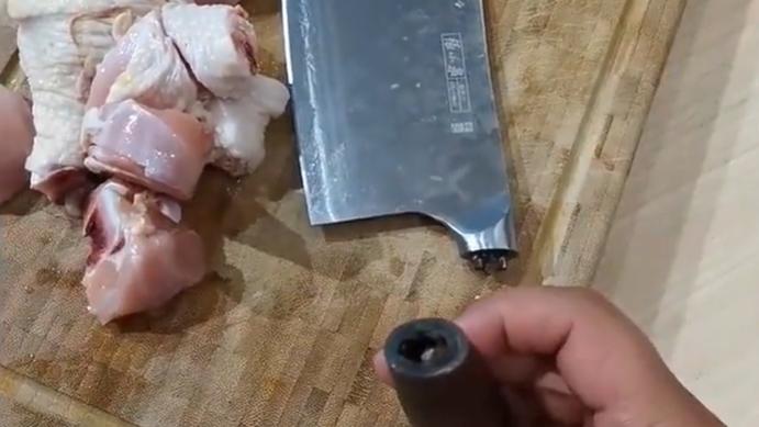 張小泉斬骨刀斬雞脾斬到斷柄。(互聯網)