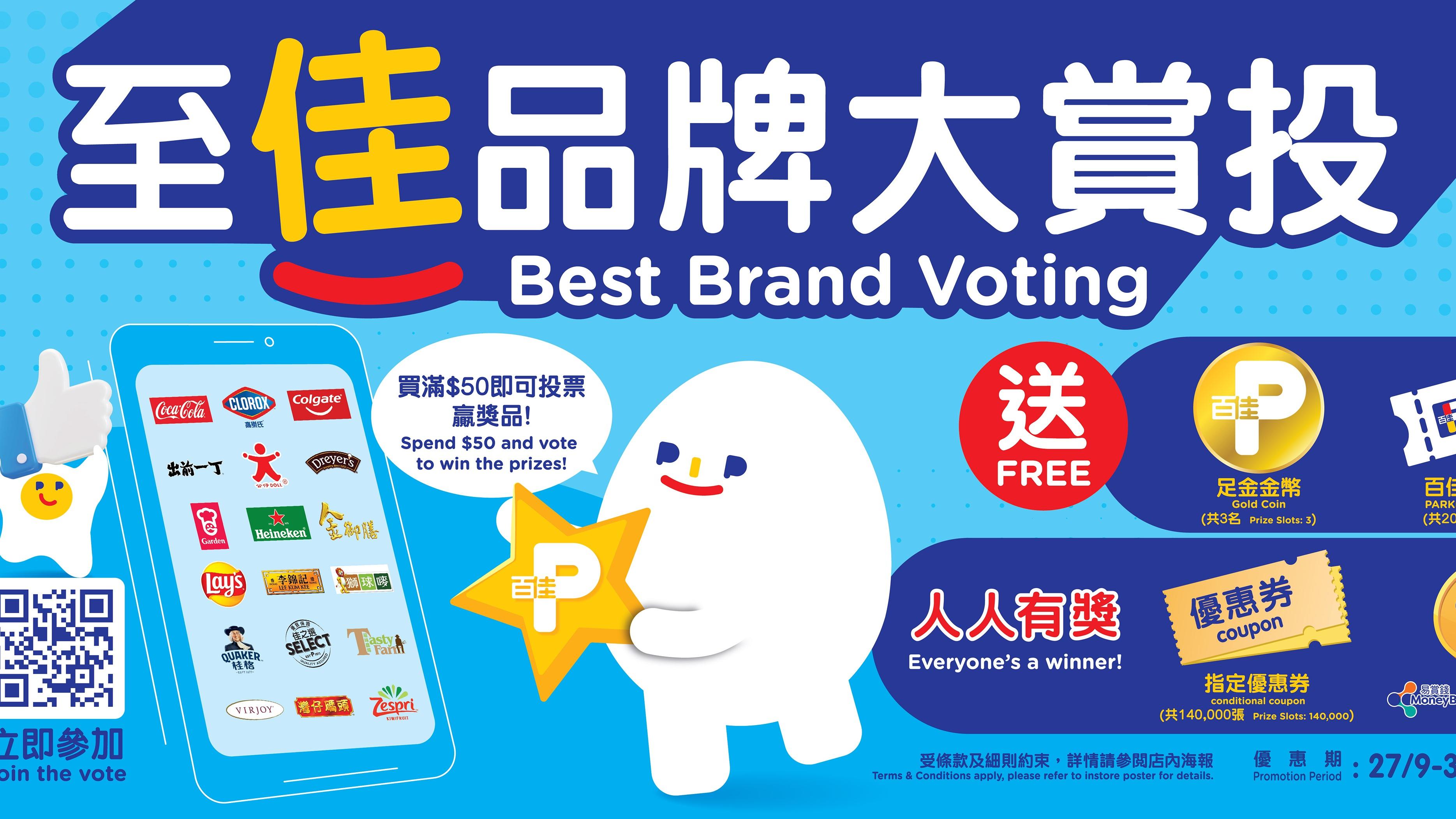 百佳「至佳品牌大賞投」 投選心水品牌 獎品人人有份 送足金金幣