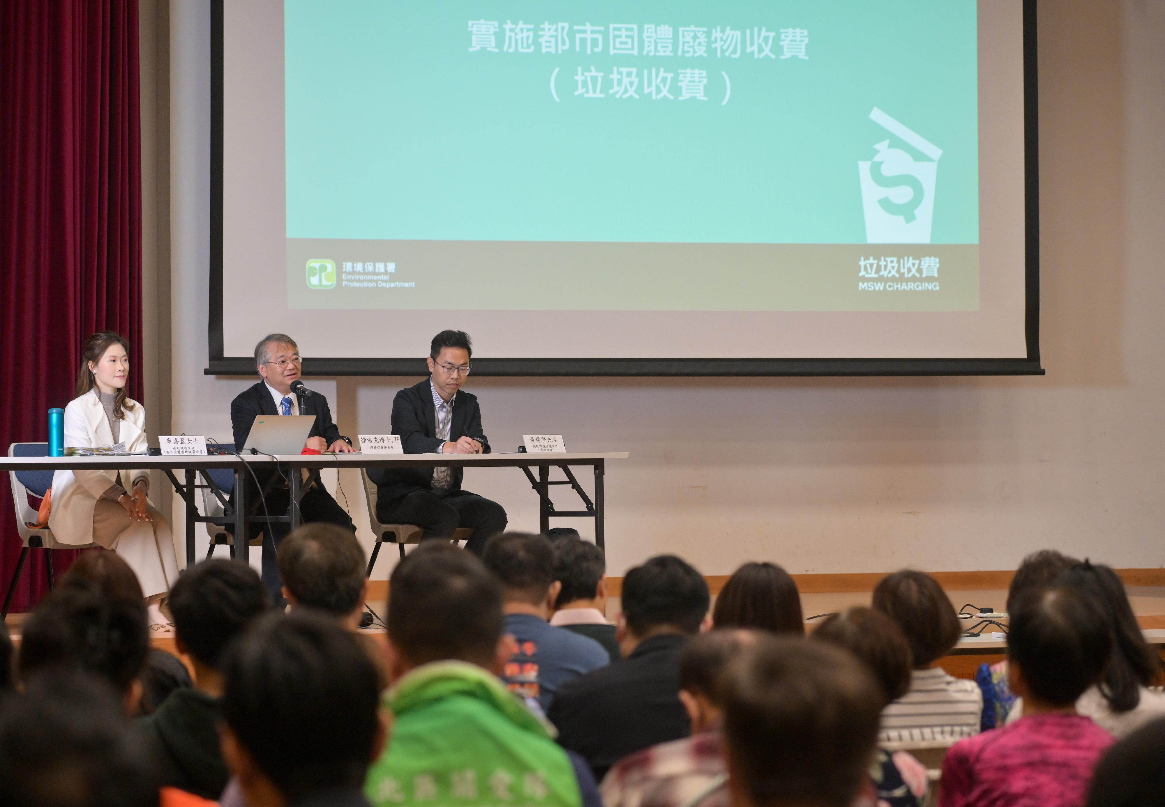 環保署在禮頓山社區會堂為地區服務及關愛隊伍(關愛隊)舉辦首場都市固體廢物收費簡介會,環保署署長徐浩光(中)向關愛隊成員講解垃圾收費的最新推行安排,以及實施第一階段管制即棄膠餐具和其他塑膠產品的細節。(政府新聞處)