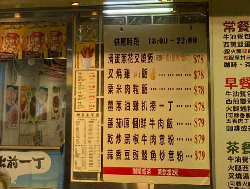 有網民日前途經九龍城,發現一間茶餐廳的晚市餐牌,一碟粟米肉粒飯竟索價78元,覺得太昂貴,發文稱「頹飯都賣$78,真係就嚟食唔起」(香港討論區圖片)