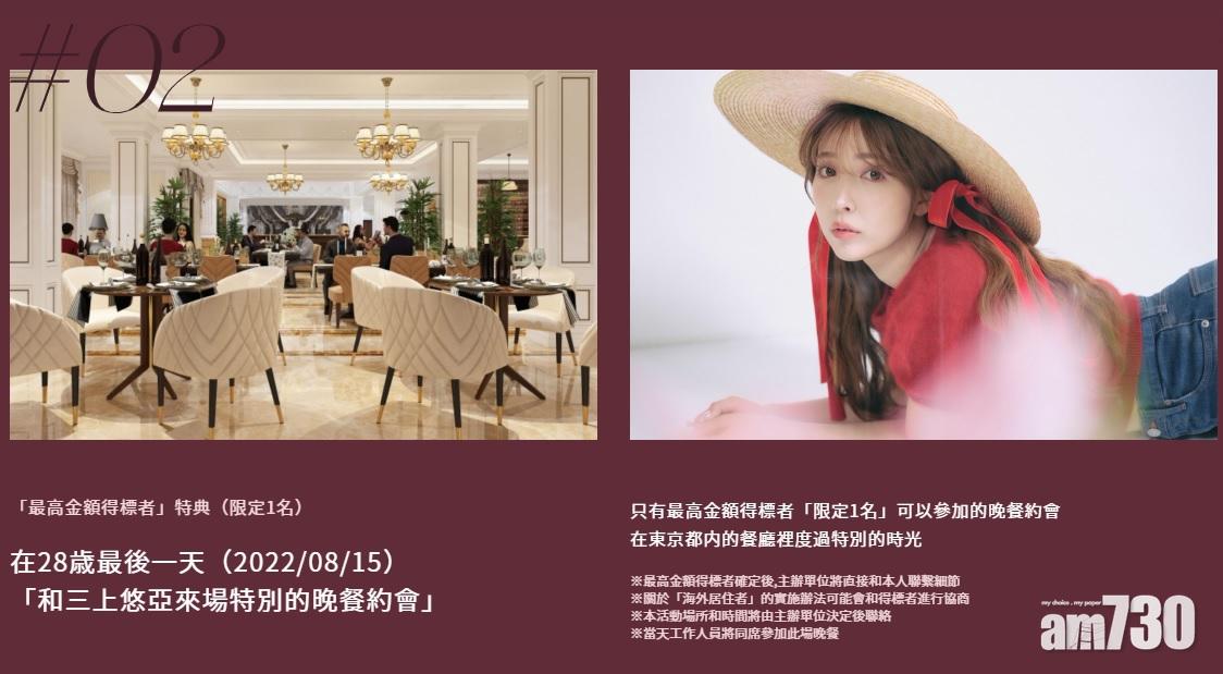 最高出價者可以在28歳最後一天(2022/08/15)「和三上悠亞來場特別的晚餐約會」。(網上圖片)