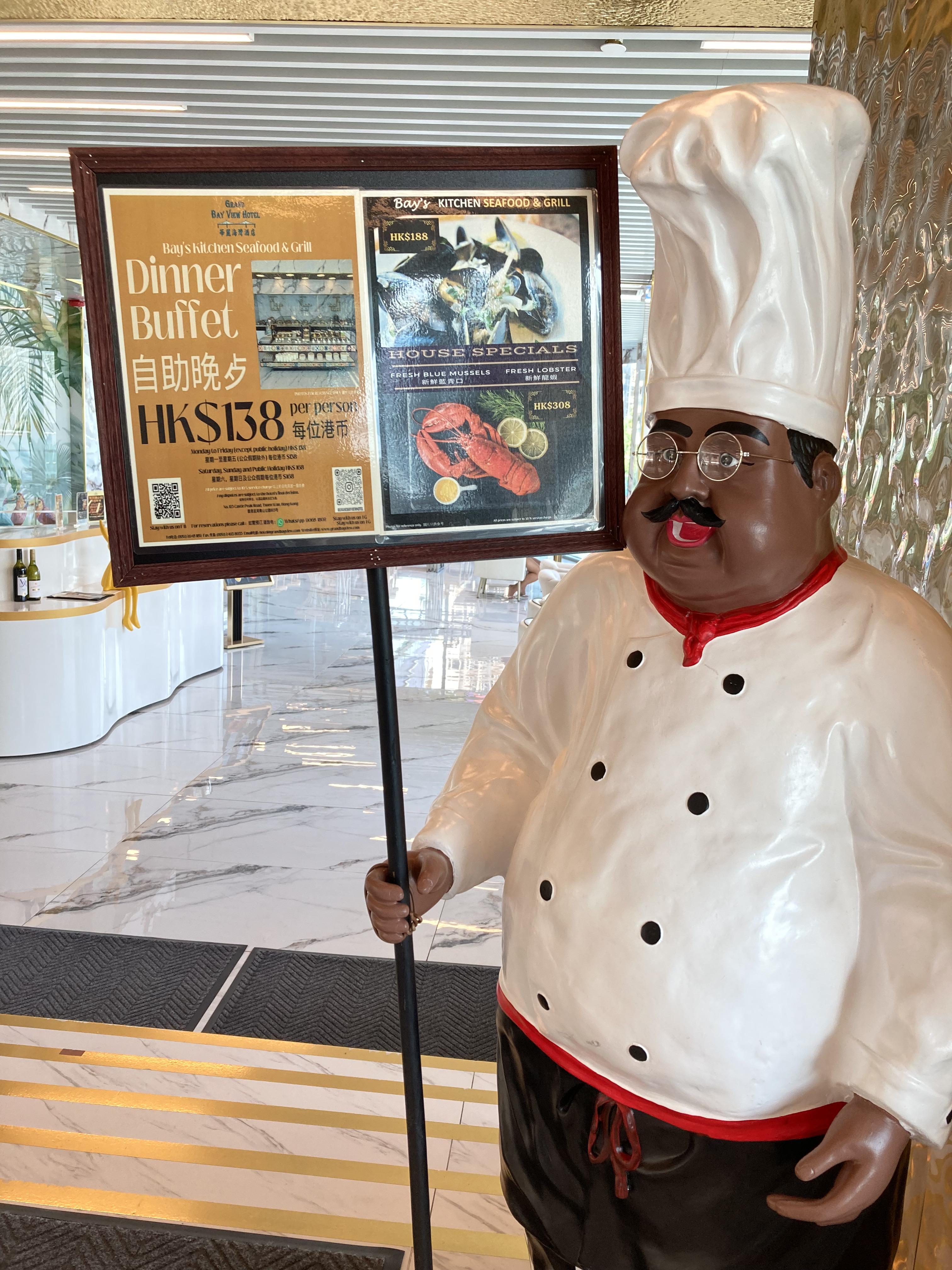 酒店餐廳有落地大玻璃,可以對著海景享用自助餐,日落景色優美,餐廳外有走廊可以影相,有打咭位,還有一個戶外小型遊樂設施。自助餐晚餐只需$138一位,有熱食,冷盤,水果及少量甜品,有果汁及茶等,還可以另加$90-120左右,有牛扒,有海鮮可加配。食物水準不錯,性價比算高。餐廳有早、午、下午茶及晚餐,留在酒店都唔怕餓親。
