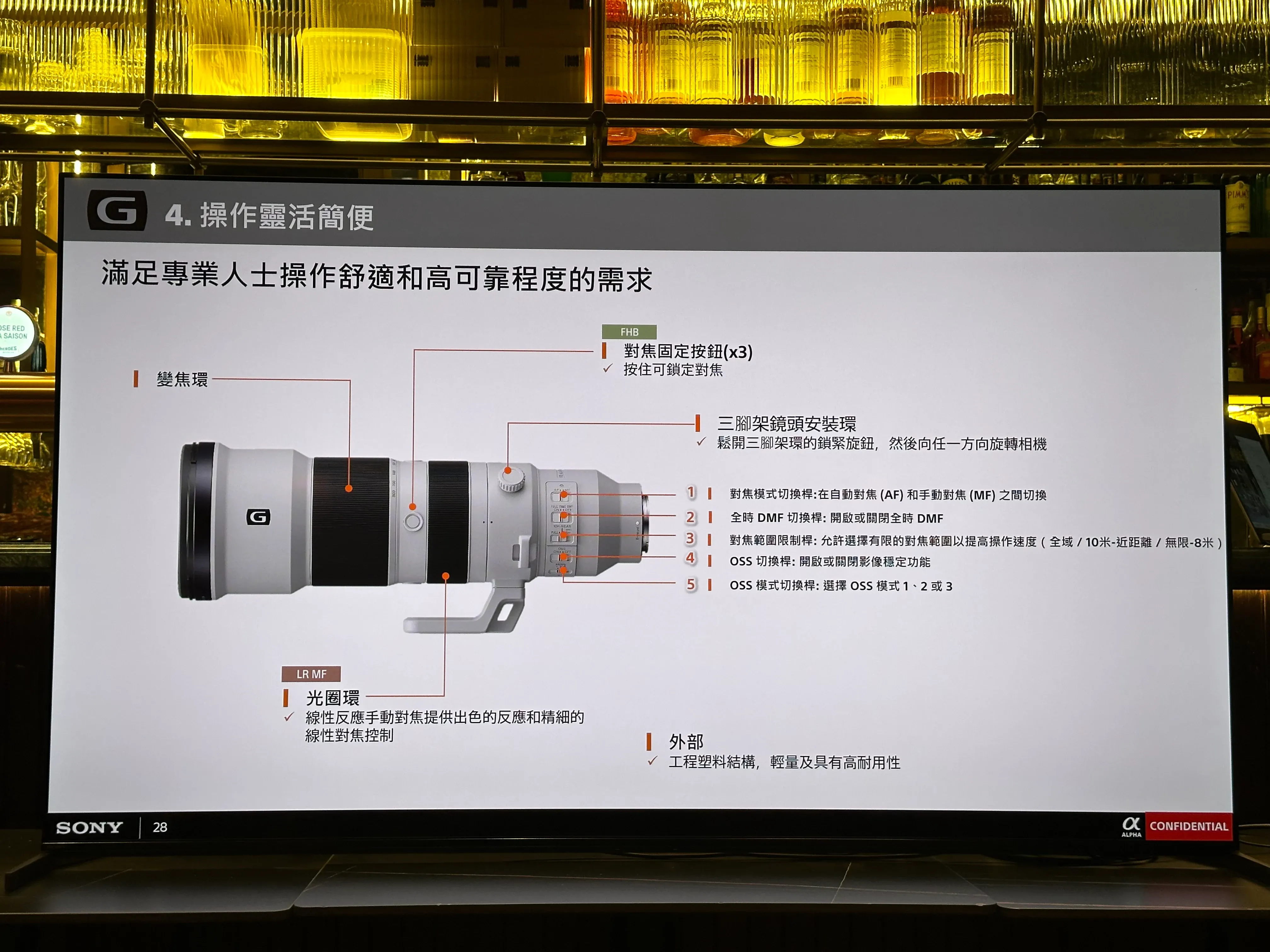 鏡頭周圍設有三個以90度間距分布的對焦固定按鈕,方便各種拍攝角度操作,並可根據需要分配不同功能。內變焦設計和防塵防潮特性提升了可靠性,而前鏡片上的氟塗層則可防止污染物並方便清潔。全時DMF功能在操作對焦環時自動啟用手動對焦,方便精細調整。全新設計的遮光罩配備鎖定按鈕和濾鏡窗口,提升使用便利性。