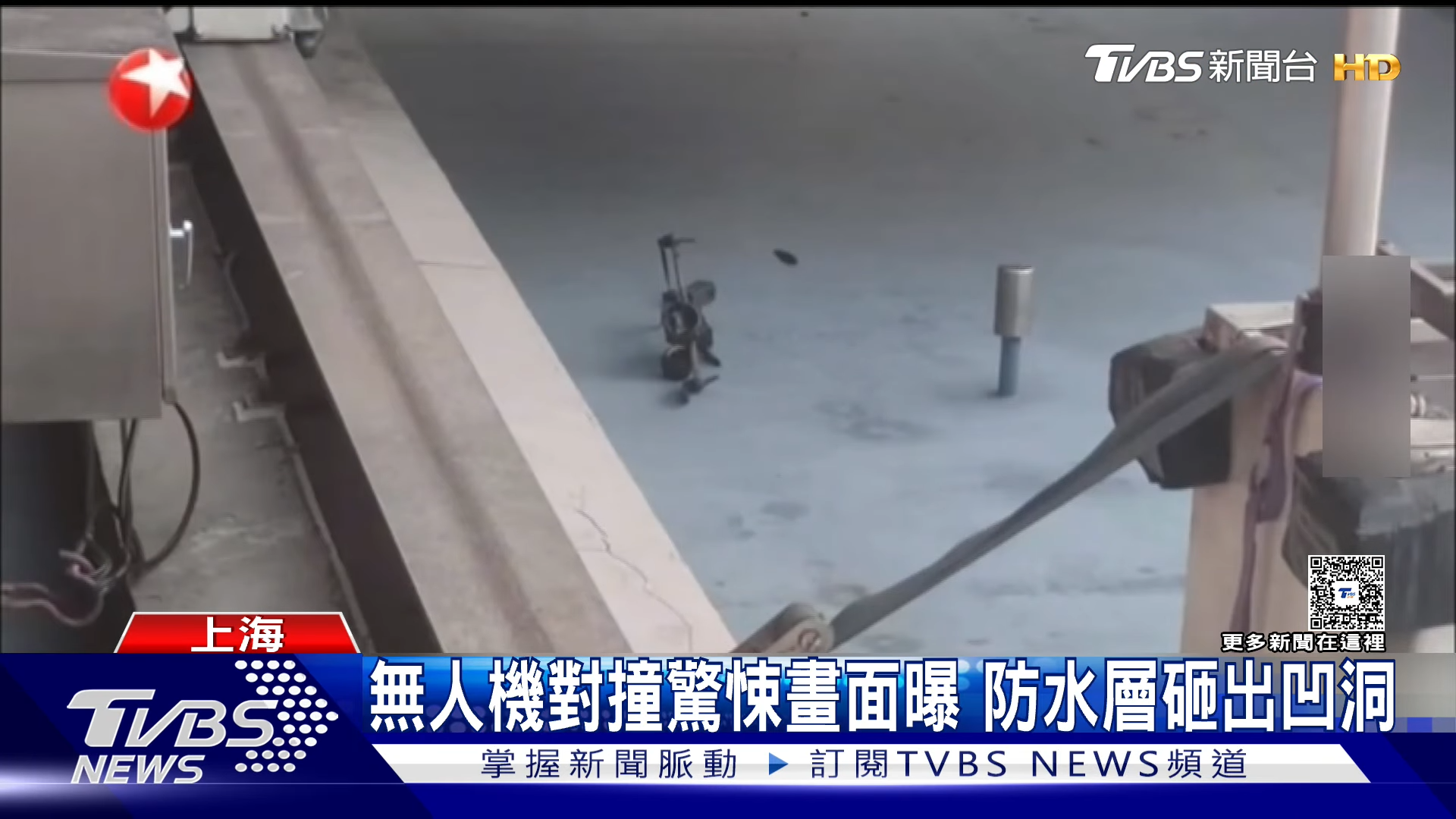 《東方網》報道,上海環球金融中心方面證實,這宗事故發生在24日下午,大廈管理運營部負責人透露,工作人員在96樓平台,發現了兩架墜毀無人機,其中一架機翼軸直接插入防水層,砸出了坑洞,造成地面穿孔破裂:「我們第一時間報警處理,目前兩架無人機已經移交警方。」