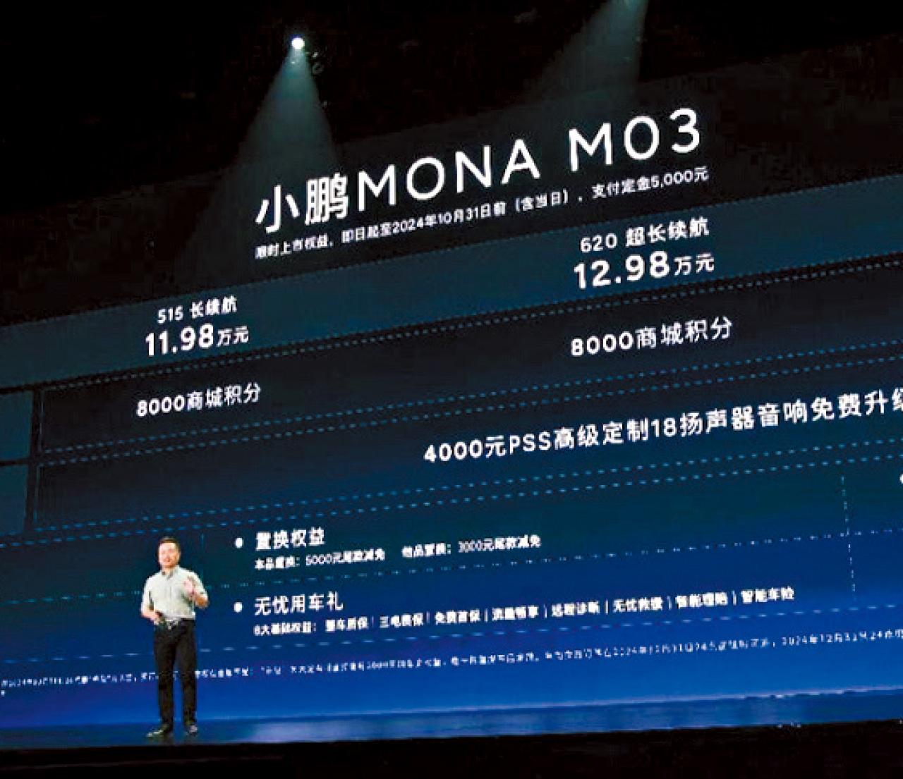 被視為內地車廠新勢力的小鵬汽車,旗下「智能純電動掀背式轎跑車型」MONA M03的3個版本正式上市,售價僅由11.98萬元人民幣(下同)起。廠方昨稱在發布會後不足一小時,MONA M03已錄得逾萬輛大訂,消息惹外界關注。