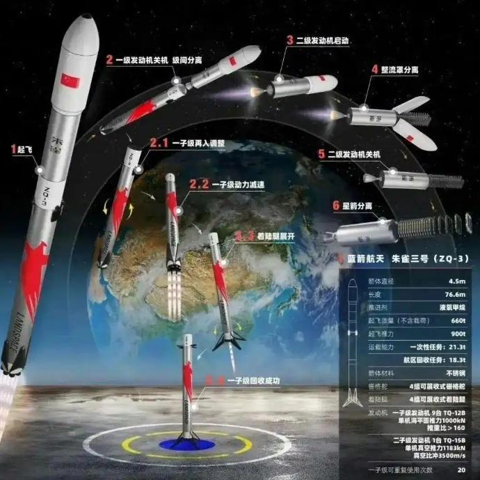 朱雀三號是2015年成立的民營藍箭航天空間科技股份有限公司自主研製的新一代低成本、大運力、高頻次、可重複使用液氧甲烷運載火箭。朱雀三號全箭長76.6米,整流罩直徑5.2米,動力系統基於藍箭航天的天鵲系列液氧甲烷發動機。