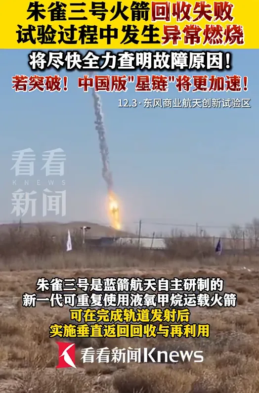 備受矚目的朱雀三號運載火箭於3日在東風商業航天創新試驗區發射升空。內媒報道,火箭二級進入預定軌道,但同步進行的火箭一級回收驗證過程中發生異常燃燒,未能在回收場實現軟着陸,回收試驗宣告失敗,具體原因正在分析排查。