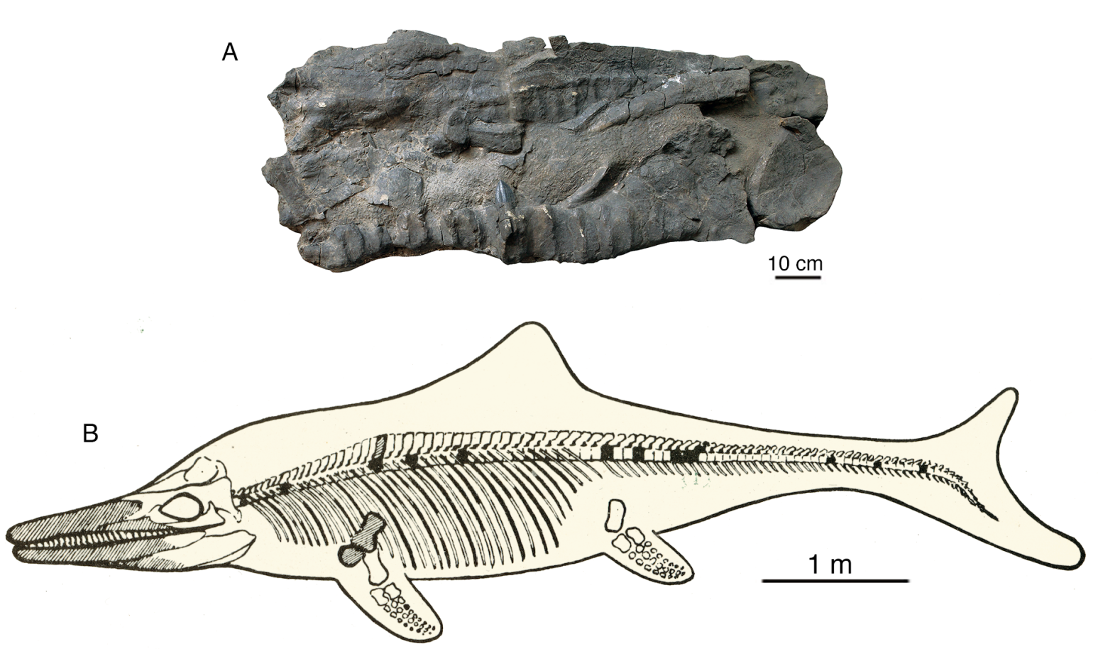 魚龍,嘴長、牙齒鋒利,身長可達10多米,生活在兩億一千萬年前的海洋中,早在恐龍稱霸陸地之前,魚龍就已成為海上霸主。20世紀60年代,內地曾採集到兩件魚龍化石標本,現已殘破。