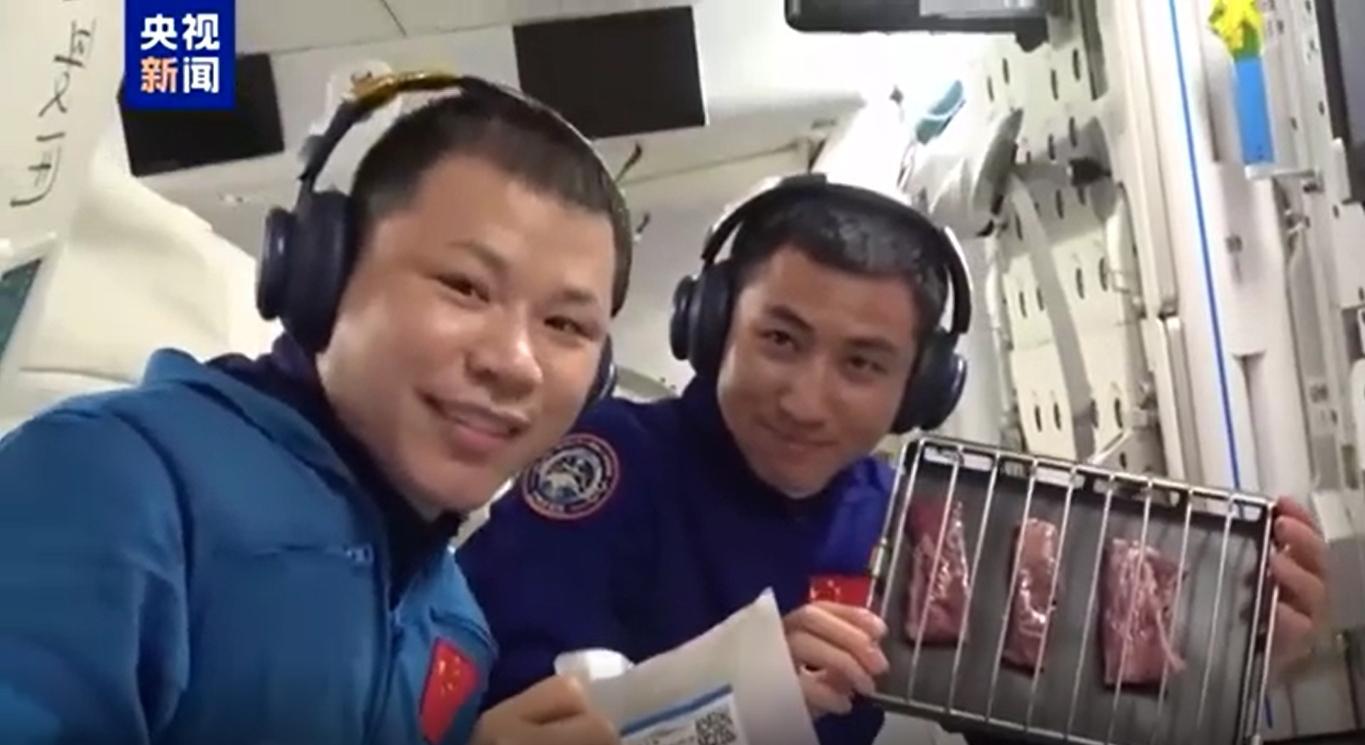 6名太空人開心地一人一隻品嘗首次在太空新鮮出爐的燒雞翼。接着,神舟二十號太空人王杰與神舟二十一號太空人武飛兩名內蒙古人,還聯手烤製了一盤熱騰騰的黑胡椒牛排。這是空間站首次上新「烤箱」,太空人食品實現了在軌烹飪烘焙。