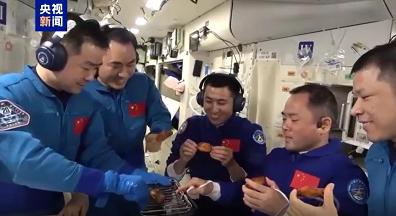 太空人武飛在空間站首次實現烤雞翅。(圖/翻攝《央視新聞》)