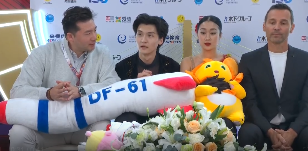 中國盃花樣滑冰大獎賽冰舞賽上周六(25日)於重慶舉行,賽後中國組合任俊霏、邢珈寧在等候分區成績期間,一度拿起觀眾拋入場內、標有「DF-61」字樣的東風61型導彈造型毛絨公仔,並做出模擬飛行動作(影片截圖)