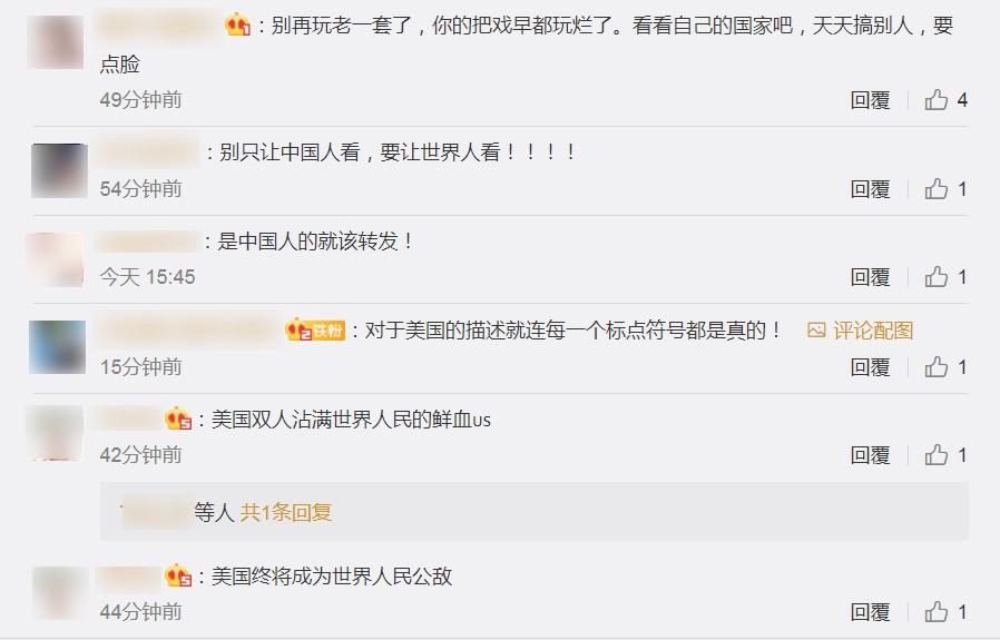 網民又指,「真正的人權是人民幸福」,並表示,「好,中國不能再沉默了,要敢於在世界發出正義的呼聲,相信五眼的人和日韓都知道美國的邪惡,但或因其強大不得不幫其遮掩,或本身劣跡斑斑而躲在美後。正義之聲說久了,自然會逐漸得到認同,因為全世界都希望有國家能夠制衡美國,讓流氓少耍幾次流氓!