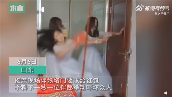 大陸山東一對新人,6月6日舉行喜宴,不過中途卻出現意外插曲,三名伴娘堵着門口,向門外的新郎要紅包才肯「放人」,不料下一秒,一名伴郎便直接將門踢開,把伴娘踢到「起飛」。