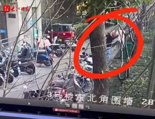 監控拍到孫伯伯的兒子(紅圈)丟掉兩床「天價棉被」。(圖/翻攝自微博)