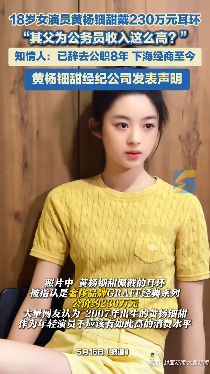 年僅17歲的女星黃楊鈿甜,日前配戴一副疑似要價230萬人民幣的英國奢侈品耳環,引發關注,由於她的父親是公務員,財力為何如此雄厚引起揣測,而此事也驚動紀委,四川省雅安市紀委監委稱「相關部門正在處理」。