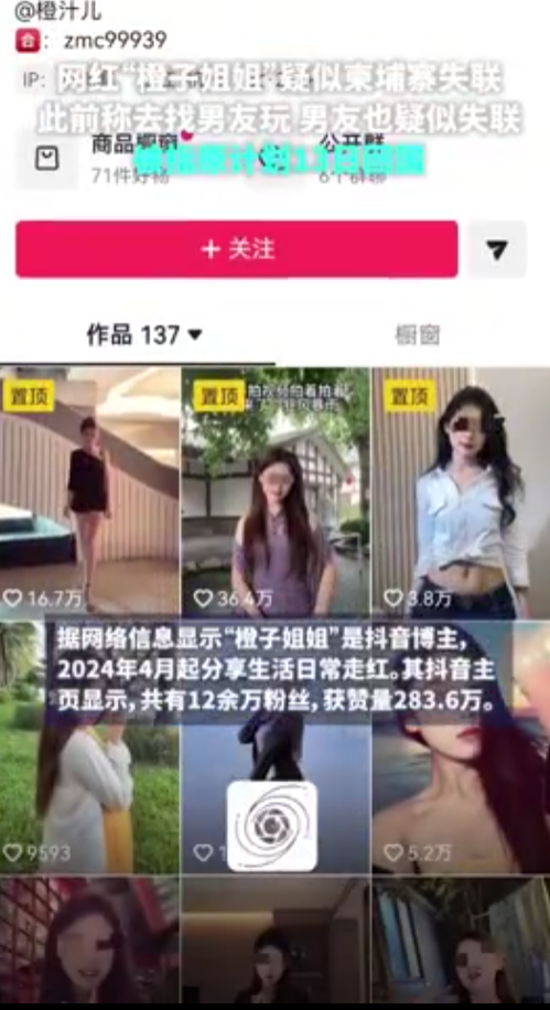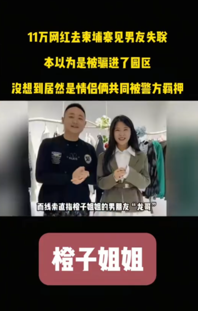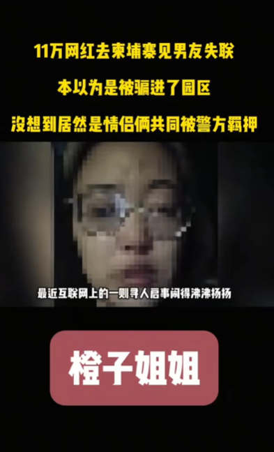 柬埔寨電騙犯罪活動風行,在抖音有逾10萬粉絲的內地網紅「橙子姐姐」,早前去柬埔寨找男友玩之後失蹤,網民擔心她被抓走送到電騙園區禁錮。其姊姊上周六(15日)於網上尋人,哭訴妹妹與男友12日起失去聯,擔心有不測;豈料峰迴路轉,今日傳出她原來是不法分子,涉詐騙和販運人口被捕。報道也展示在網上扭腰擺舞、青春美麗的橙子姐姐真容,沒有美圖效果下樣子普通。
