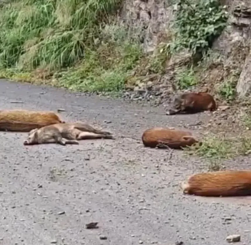 網傳影片中,狹窄山路上「屍橫遍野」多頭野豬倒在地上一動也不動,其中一頭野豬看似受到重傷,一度掙扎著想要站起來,最終也不支倒地。另一段影片則顯示野豬已被清理帶走,僅剩地面上有幾灘血跡。
