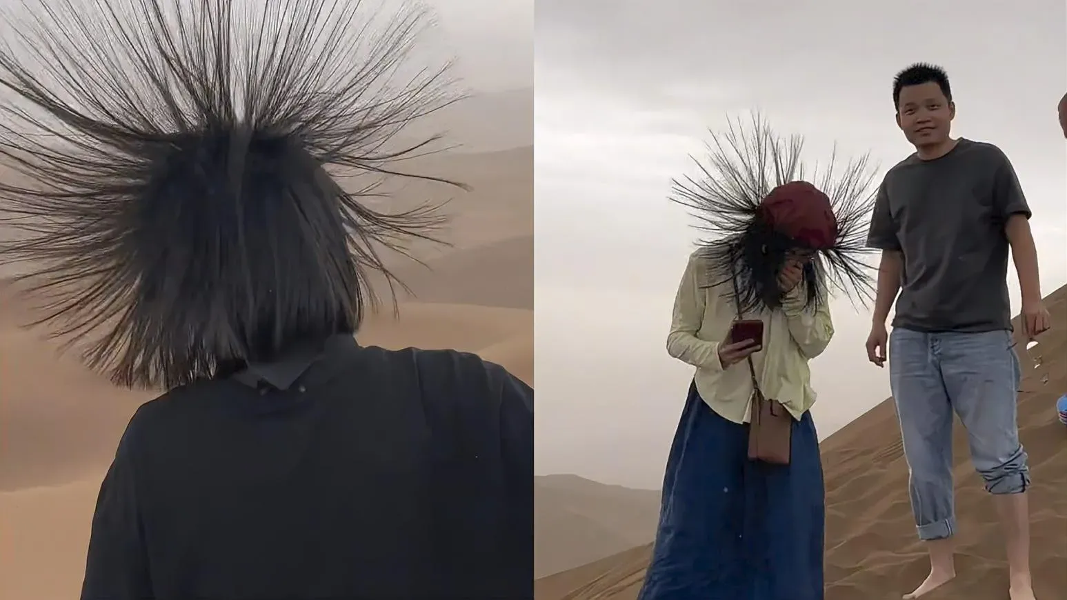 網傳影片中,這幾名遊客的頭髮都直直地豎立了起來,尤其是女生,頭髮本來就長,畫面上看來格外搞笑有趣。據影片拍攝者表示,一行人到了沙漠一高處稜線上,本想開始玩滑沙,天空卻突然下起小雨,10秒鐘後頭髮變「爆炸頭」站了起來,手機還發出電流聲,當下覺得不太對勁,就趕緊離開。