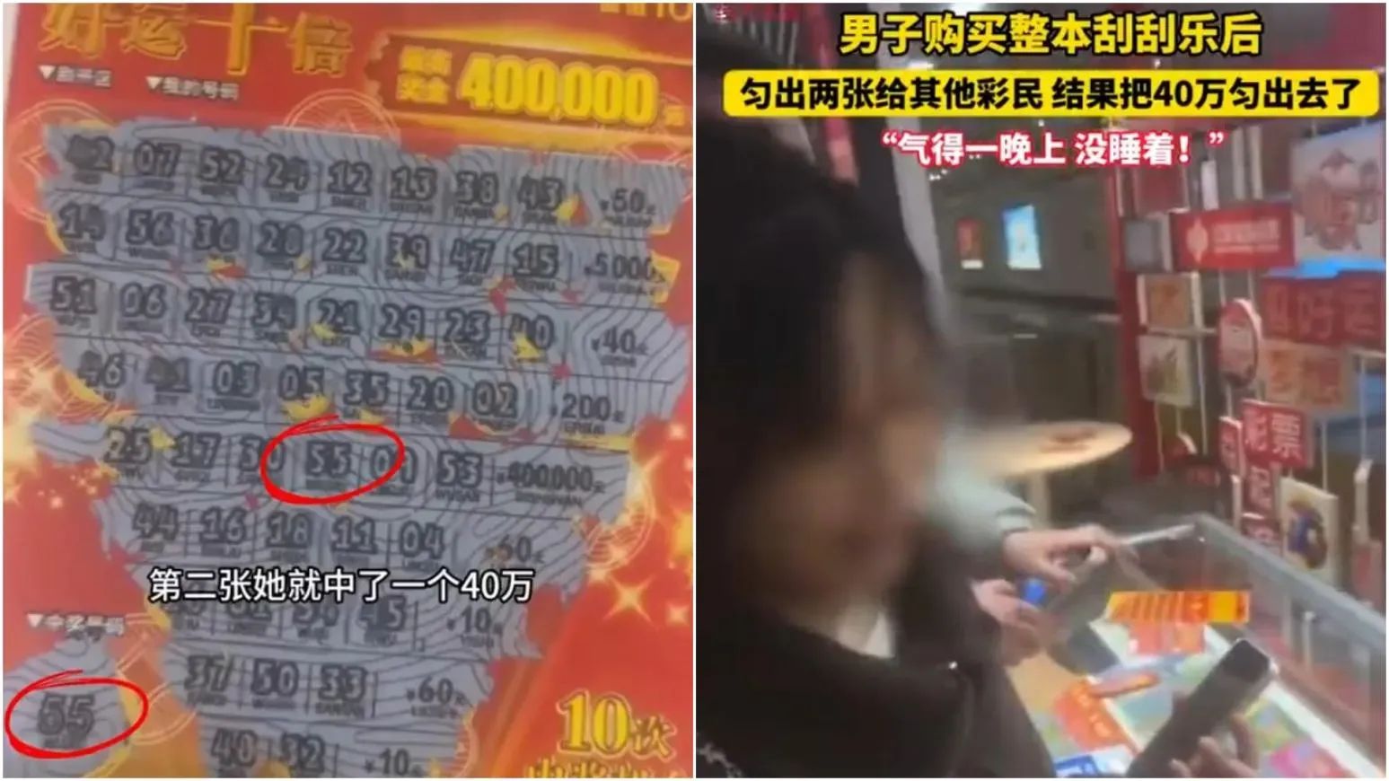 結果接下來的發展,讓男子悔恨一輩子。他受訪時表示,「她抽了之後,第二張她就中了一個40萬,當時氣得我一晚上都沒睡著」。