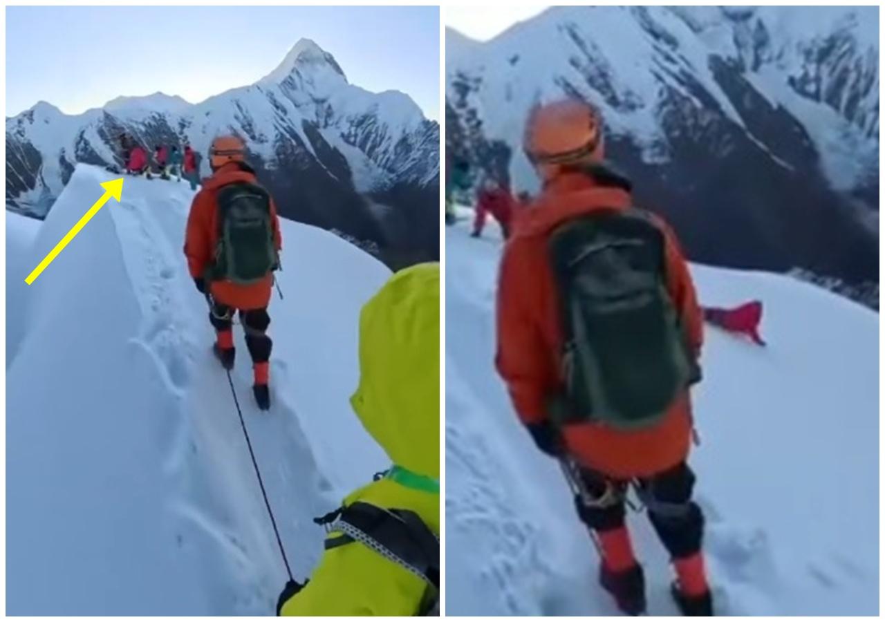 綜合報道,事發於上周二(23日),從後方另一隊登山隊錄製的影可看到,畫面前方一名身穿紅衣的男子原本是蹲姿,準備起身時卻突然身體前傾,接著重心不穩滾下山。畫面中不少人在吶喊,也可看到紅衣男試圖穩住身子、站起,但滑落速度太快,他就在眾目睽睽滑倒墮崖。