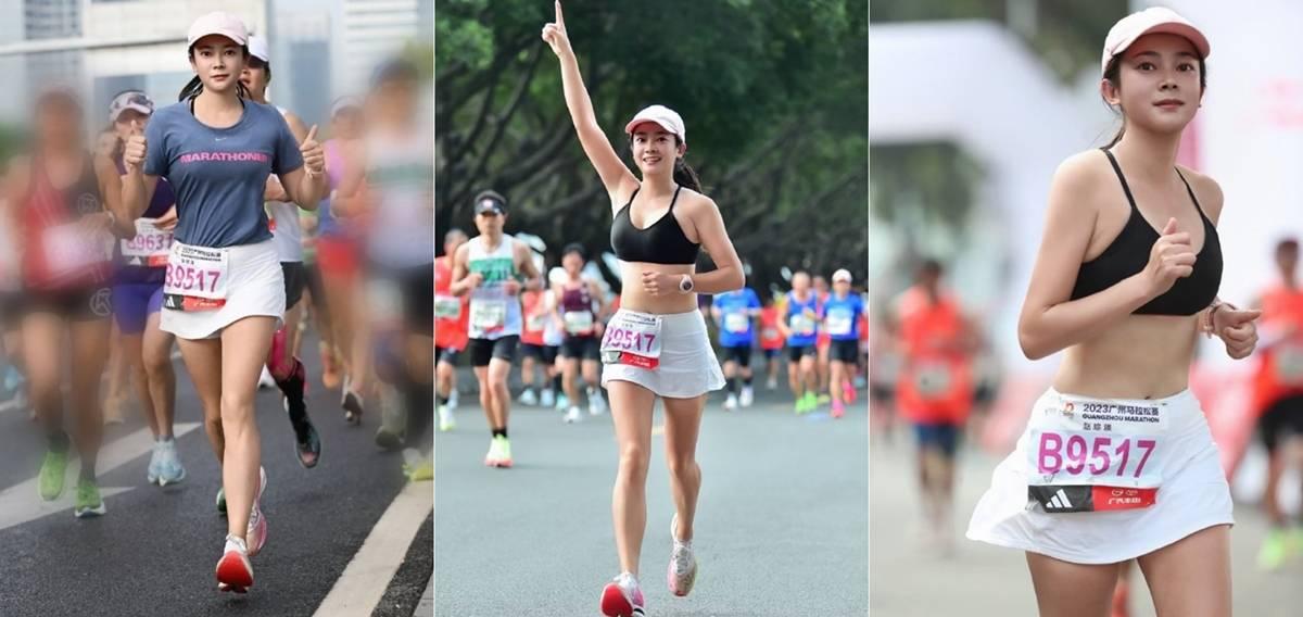 微博有逾55萬粉絲的「精英跑者elite」,經常分享馬拉松賽事相關資訊與場邊花絮。日前,他貼出了一組2023廣州馬拉松照片,一名大眼靚女身穿藍色T恤、白色短裙參賽跑步,過程中還把身上的T恤脫掉,只留下一件黑色的運動內衣,展現美好身材。