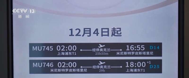 全球最長的單程航線正式通航,由上海經新西蘭奧克蘭飛往阿根廷首都。(央視新聞截圖) 新航線往返編號為MU745/MU746,航程超過25小時。(央視新聞截圖)