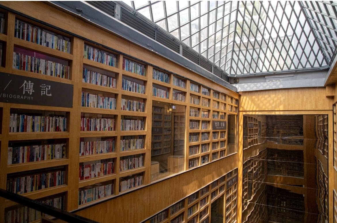 推門而進,書店長廊兩旁是6層樓、達30米高的巨型原木色書牆,看上去像極《哈利波特》小說內霍格華茲魔法學院的古典書牆。一層層巨型木質書架排列着各式書籍,整齊有緻,種類豐富。