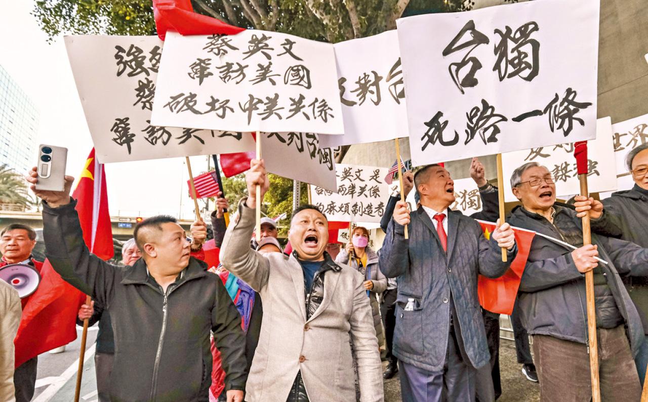 部分反對台獨的示威者在蔡英文下榻酒店外抗議。(美聯社)