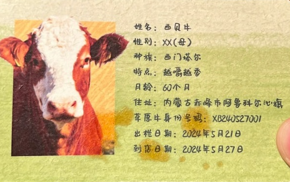 據網友PO出的照片,該張牛「身分證」詳細記載了資訊。包括性別為母,種族是西門塔爾,月齡60個月。出欄日期是2024年5月21日,到店日期是5月27日。上面還標注了牠的「住址」是在內蒙古赤峰市阿魯科爾沁旗,並給了牠「身分號碼」,更附上了牛的彩色照。