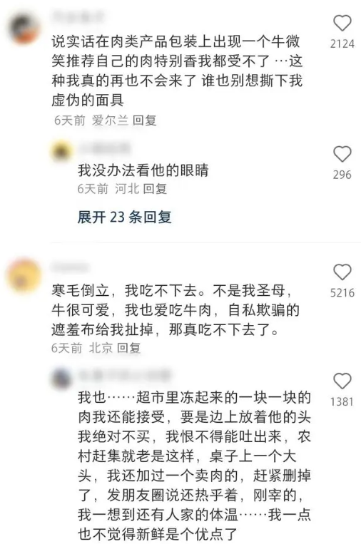 還有網友稱:「說實話在肉類產品包裝上出現一個牛微笑,推薦自己的肉特別香(的畫面),我都受不了。這種我真的再也不會來了」、「寒毛倒立,我也愛吃牛肉,真吃不下去了」。