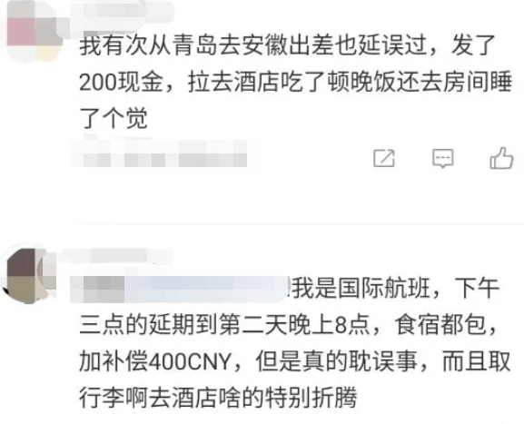 影片在微博引發熱議,不少網友也分享了自己遇到的類似狀況,班機延誤直接發現金補貼。也有網友分享自己的經驗,「發了200元現金,拉去飯店吃了飯,還去房間睡了覺」、「食宿都包,加補償400元,但是真的耽誤事」、「空姐送了4回吃的,然後起飛發了200元」。
