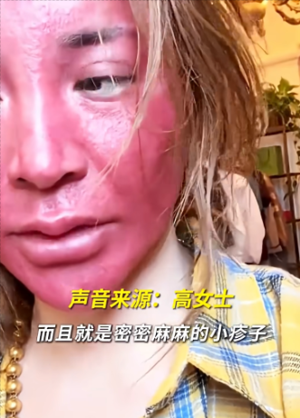 網傳影片中,37 歲高女士整張臉腫脹發紅,宛如熟透番茄,似乎連睜眼都十分困難,仔細一看臉上長滿密密麻麻的紅疹子,她自述皮膚硬化灼熱、劇烈瘙癢:「滿臉都是皺皺巴巴,特別難看天天在家也不敢出屋,不敢見人也不敢交朋友」。