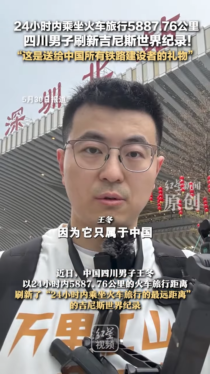 《紅星新聞》報道,這名男子王冬於今年2月14日,從廣東首深圳市北站啟程,24小時內完成三次換車,行程遍及深圳、北京、貴陽與宜賓,由於計劃緊湊,他一秒鐘都不能耽誤:「深圳北的列車提早1分鐘發車,這看似不經意的1分鐘,卻在整趟旅程中造成了蝴蝶效應。」他表示,因為抵達四川省宜賓站時,距離24小時結束只剩40秒,他笑說,「真的是命懸一線」。