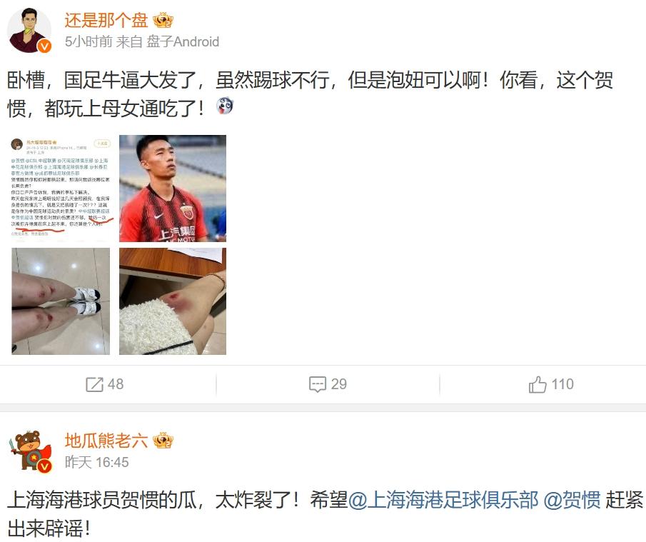 繼籃球明星易建聯傳出疑似性交易後,足球圈也驚爆醜聞,現年31歲的「國腳」賀慣,近日遭一名女網友指控趁她受傷時性侵,還疑似與她的母親也有往來,導致母親「癱在床上起不來」,消息曝光立刻引發網友熱議,而賀慣疑似已經清空個人微博。