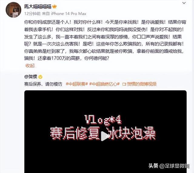 這個網名叫做「馬大喵喵喵喵」的女子在微博上披露,她與賀慣有感情糾葛,但對方卻頻頻傷害自己,她甚至被家暴,她指控,賀慣無視她的傷勢要求發生性行為,「在我渾身是傷的情況下,又是把我睡了一次」、「這就是你作為中國足球運動員的素質?」