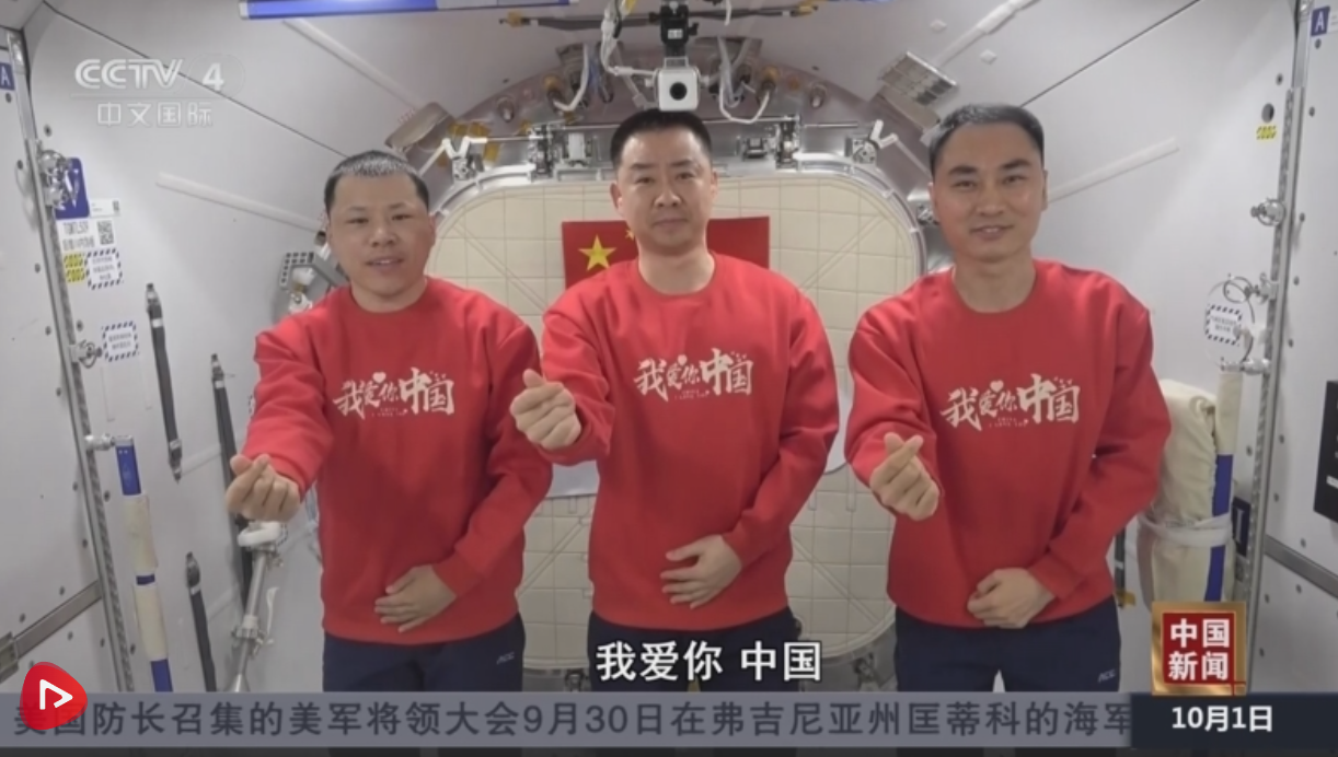 身處中國「天宮」太空站的神舟二十號3名航天員陳冬、陳中瑞和王杰從太空民送來祝福,也傳回了五星紅旗與地球同框的珍貴影像。3人一起換上寫有「我愛你中國」字句的紅色上衣,祝福祖國繁榮昌盛,祝福全國各族人民幸福安康。陳中瑞說,每當穿著艙外航天服在太空中遙望祖國大地,心中充滿了自豪和榮光。