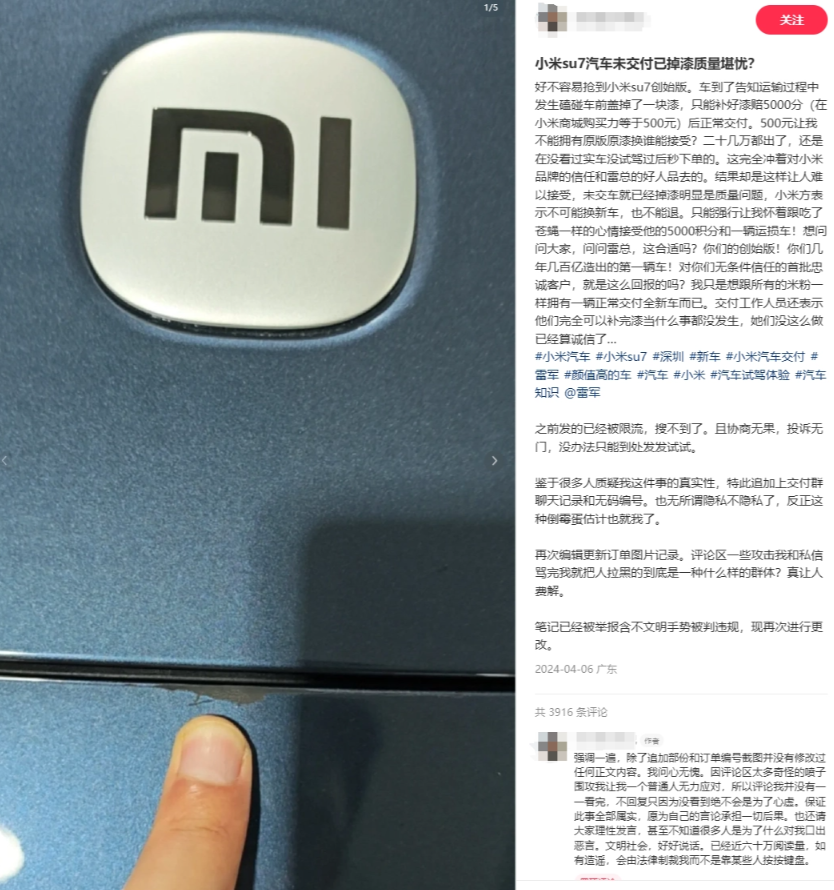內地有報道指,廣東深圳一名姓莫女子於本月6日發文,稱「好不容易搶到小米SU7創始版」,未料在車運抵時被告知「運輸過程中發生磕碰(導致)車前蓋掉了一塊漆」。據報莫女曾要求更換另一輛新車,但小米一方只肯安排補漆,另外再賠償5,000積分(在小米商城使用相當於500元人民幣)。